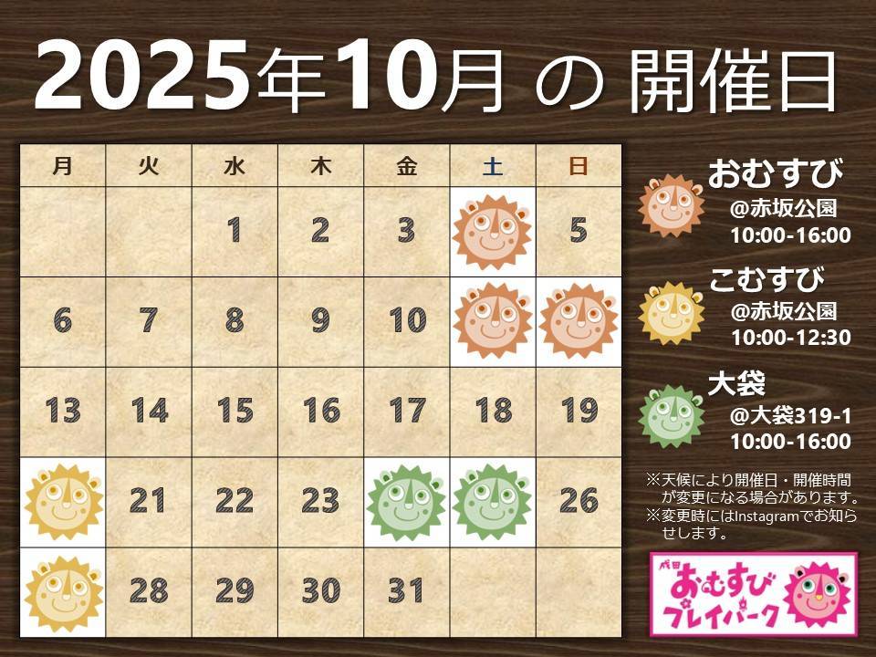 お知らせ&スケジュール 12月の開催日カレンダー 早いもので もう12月 カレンダーアップしま〜す 第1・2土曜日は赤坂公園お花見広場にて 1日プレイパーク 10:00〜15:30(おむすびはサンくんマーク) 14(土)11:00〜19:00 15(日)11:00〜18:00は…そよら... 2024.12.03 お知らせ&スケジュール開催カレンダー